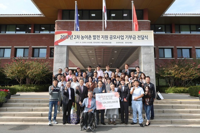 [세계타임즈 신민정 기자]한국마사회(회장 이양호) 렛츠런파크 서울 본관 대회의실에서 기부금 전달식이 열렸다. 이양호 한국마사회장 겸 렛츠런재단 이사장, 김학신 렛츠런재단 사무총장이 참석한 가운데, ‘렛츠런재단과 함께하는 2017년 제2차 농어촌 발전지원 공모사업’에 최종적으로 선정된 31개 단체에 기부금 약 3억 2천 4백만 원을 전달했다.