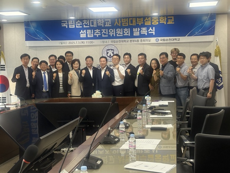 [전남 세계타임즈=우덕현 기자] 전라남도의회 정영균 의원(더불어민주당, 순천1)은 7월 3일(목) 오전 11시, 국립순천대학교 본부 4층 중회의실에서 열린 ‘국립순천대학교 사범대부속중학교 설립 추진위원회(이상대 위원장)’ 발족식에 참석하며 본격적인 설립 논의에 힘을 보탰다.
