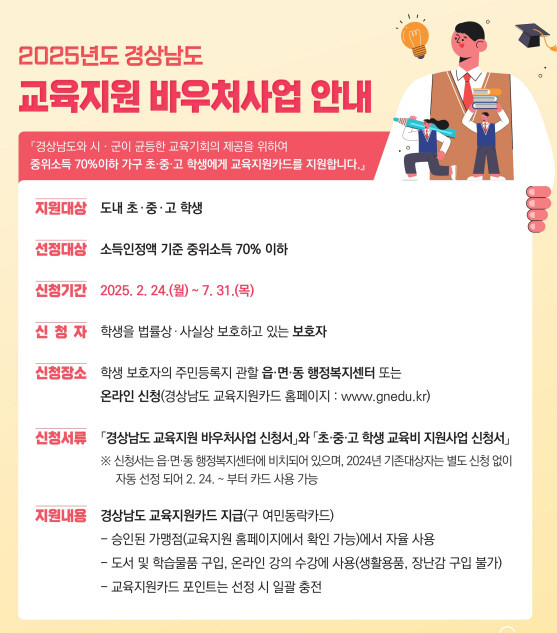 올해 지원대상은 중위소득 70%(4인가구 기준 약 426만원) 이하 가구의 초·중·고 학생으로 선정된 학생에게는 연간 10만원의 포인트가 적립된 ‘경상남도 교육지원카드’가 지급된다.