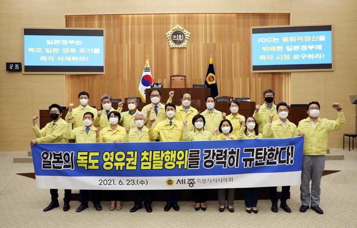 [세종=세계타임즈 이채봉 기자] 세종시의회는 23일 제69회 정례회 3차 본회의에서 ‘일본의 독도 영유권 침탈행위를 규탄하는 결의안’을 만장일치로 채택하고, 도쿄올림픽 홈페이지 지도에 독도를 일본의 영토로 표기한 일본 정부의 독도 영유권 침탈 행위에 대해 강력 규탄하고 즉각 삭제를 요구했다.