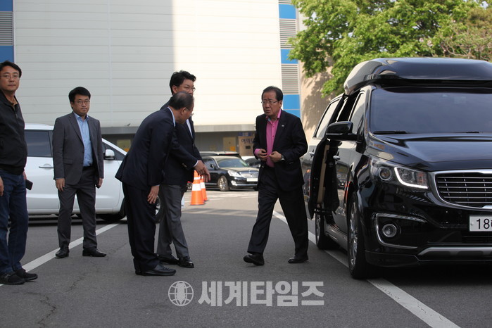 자유한국당 홍준표 대표가 김성태 원내대표 여의도성모병원 응급실 방문하기위해 자동차에서 내리는 모습