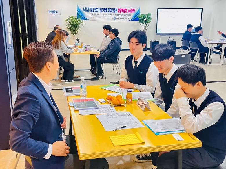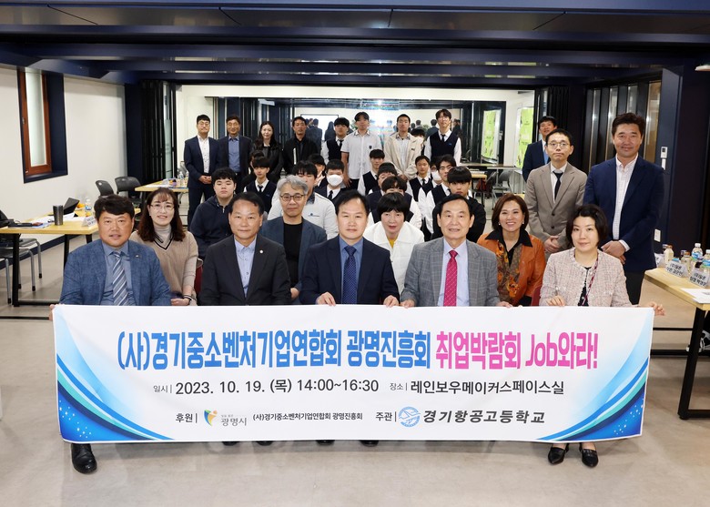 [광명시 세계타임즈=송민수 기자] 광명 소재 경기항공고등학교(교장 유형진)는 2023. 10. 19.(목) 광명시와 경기중소기업연합회 광명진흥회가 후원하는 교내 ‘JOB 와라’ 취업박람회를 개최했다. 학교 규모가 그리 크지 않은 특성화고등학교에서 자체적으로 교내 취업박람회를 개최한다는 것은 매우 드문 일로, 이번 취업박람회에는 광명진흥회 소속 회원사 6개 업체와 기 협약된 서울 소재 1개 업체가 참여하여 약 3시간 가까이 성황리에 개최됐다.