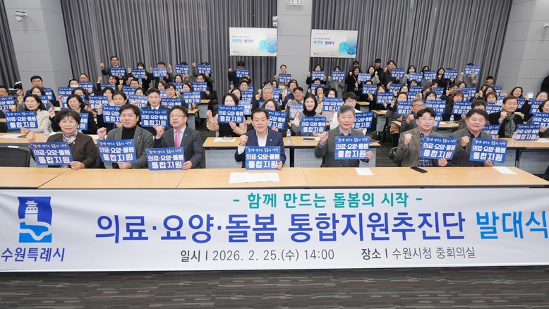 수원시는 25일 시청 중회의실에서 열린 의료·요양·돌봄 통합지원추진단 발대식을 열었다. 이날 발대식에는 이재준 수원특례시장, 김현수 제1부시장, 수원시의회 김정렬 수원시의회 부의장과 시의원, 돌봄통합지원협의체 위원 등이 참석했다.