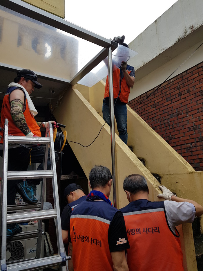 이날 천막교체 봉사는 서구자원봉사센터(센터장 윤혜숙)의 지원으로 천정훈 집수리 봉사단장을 비롯한 자원봉사 10명이 비오는 날씨에도 2층 누수 천막과 1층 노후 천막 교체 봉사를 하였다.