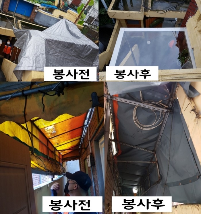 천정훈 집수리봉사단장은 “오늘 천막교체 봉사로 장마철에 빗물누수로 고생하는 아이들이 편하게 생활할 수 있게 되어서 행복과 보람을 느낀다.”고 말했다.