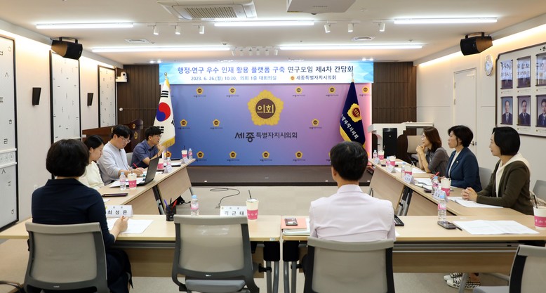 [세종 세계타임즈=이채봉 기자] 세종특별자치시의회(의장 이순열)는 26일 세종시의회 대회의실에서 ‘행정·연구 우수 인재 활용 플랫폼 구축 연구모임(대표의원 김현옥)’ 제4차 간담회를 개최했다. 이날 연구모임에서는 ‘의정발전 및 시민 복리 증진을 위한 우수 인재 조사 및 활용방안 연구용역’ 추진 상황을 점검하고 논의하는 시간을 가졌다.
