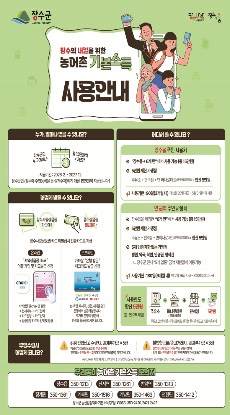 아울러 이날은 장수군 농어촌 기본소득이 선정된 이후 첫 지급이 이루어진 날로, 장수몰이 기본소득 지급 수단인 지역상품권 chak카드 결제가 가능하다는 점을 적극 홍보하고, 이를 활용한 소비 촉진 방안도 안내했다.