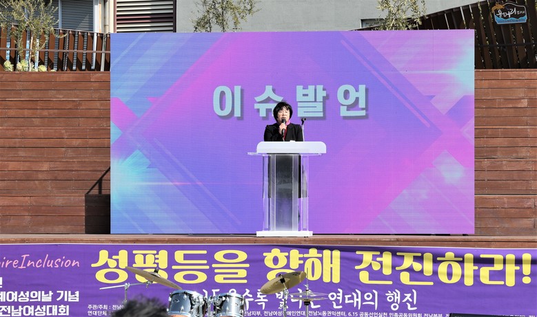 [전남 세계타임즈=우덕현 기자] 전라남도의회 보건복지환경위원회 오미화 의원(진보당·영광2)은 지난 3월 8일 세계여성의날을 맞아 여수 이순신광장에서 개최된 ‘제15회 전남여성대회’에 참석해 저출산 및 인구 고령화 문제와 성평등과의 연관성에 관해 이슈 발언을(세상을 향해 말하다) 했다.