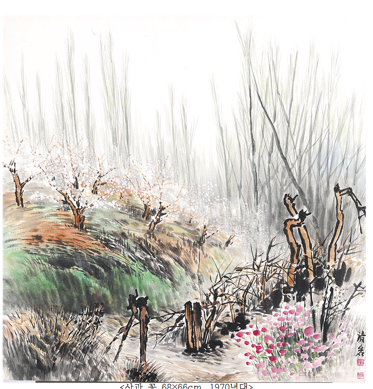 다만 ‘청암’선생님의 경우는 작품 활동 초기부터 83년까지는 주로 실경산수를 그리시다가 이후 관념 산수에 애착을 느끼시게 되었다고 한다. 이후 선, 점 중심의 그림에 면을 이용하여 반추상적인 산수화로 변화하게 되었다. 수정을 할 수도 없고 번짐 현상이 심한 동양화에서는 다루기 어려운 색을 투입하여, 구름이나 파도가 마치 살아서 움직이는 듯한 입체감을 표현 해내셨다.