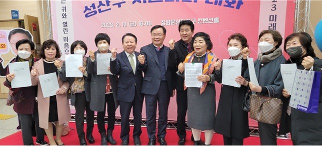 이재두 경남도의원(국민의힘·창원6)과 성산구 지역 주민 대표, 창원 파크골프 동호인 등은 10일 창원문성대학교 컨벤션홀에서 열린 ‘2023 창원특례시 시민과의 대화’ 행사에 참석해 홍남표 시장에게 가음정공원에 파크골프장 설치를 요청하는 성산구 지역 주민 4,000여명의 서명을 첨부한 청원서를 전달했다.
