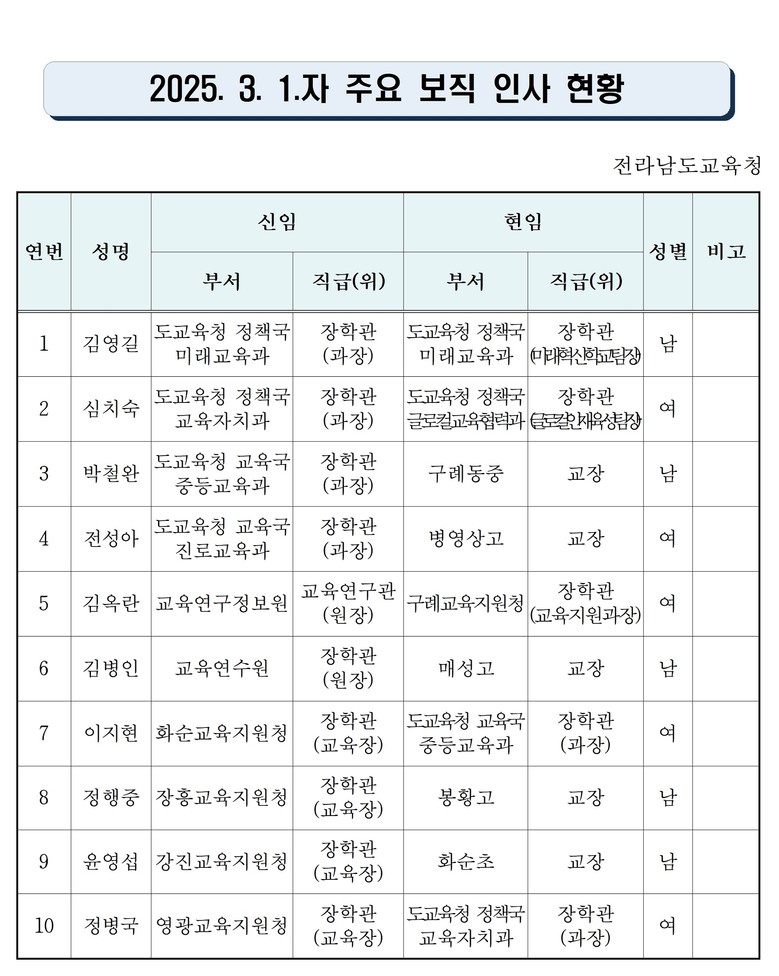 전남교육청은 이번 인사에서 ▲ 미래교육과장에 김영길 미래교육과 장학관 ▲ 교육자치과장에 심치숙 글로컬교육협력과 장학관 ▲ 중등교육과장에 박철완 구례동중 교장 ▲ 진로교육과장에 전성아 병영상고 교장을 각각 임명했다. 또한, ▲ 교육연구정보원장에 김옥란 구례교육지원청 교육지원과장 ▲교육연수원장에 김병인 매성고 교장 ▲ 화순교육장에 이지현 중등교육과장을 ▲ 장흥교육장에 정행중 봉황고 교장 ▲ 강진교육장에 윤영섭 화순초 교장 ▲영광교육장에 정병국 교육자치과장을 각각 임용했다.