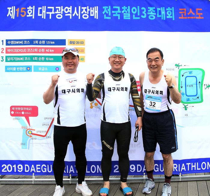 대구광역시의회 강민구 의원(수성구, 더불어민주당), 김태원 의원(수성구, 자유한국당), 전경원 의원(수성구, 자유한국당)은 지난 28일 수성못과 신천동로 일원에서 개최된 ‘제15회 대구광역시장배 전국철인3종대회’ 릴레이팀 경기에 참가하였다.