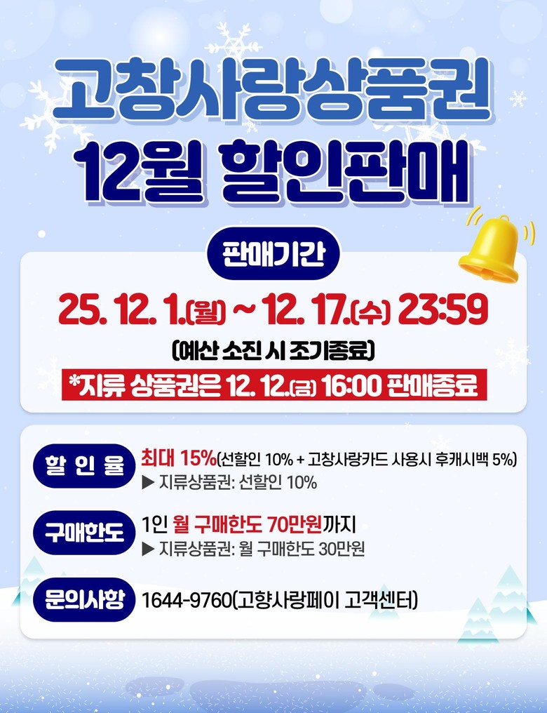 이번 12월 할인판매는 고창사랑카드는 12월17일 자정 전까지, 지류상품권의 경우 12월12일 오후 4시까지 구매할 수 있다.