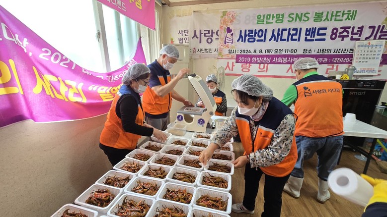 [대전 세계타임즈=이채봉 기자] 지방자치단체의 보조금 지원없이 대전지역 소외계층을 위해 9년째 다양한 봉사활동을 매월15회~20회를 하고 있는 사랑의 사다리 밴드(리더 이정제) 봉사단체는 4일 맛있는 밑반찬을 만들어서 대덕구 소외계층 80가정에 전달하면서 따뜻한 사랑을 실천 하였다.