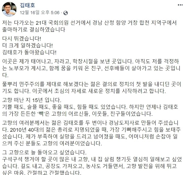 [세계타임즈 이판석 기자] 지난 16일 경남도지사를 지낸 자유한국당 김태호 전 의원이 자신의 페이스북에 "21대 국회의원 선거에서 경남 산청·함양·거창·합천 지역구에서 출마하기로 결심했다"며 "더 크게 일하겠다"라는 입장문을 올려 총선 출마를 공식화했다.