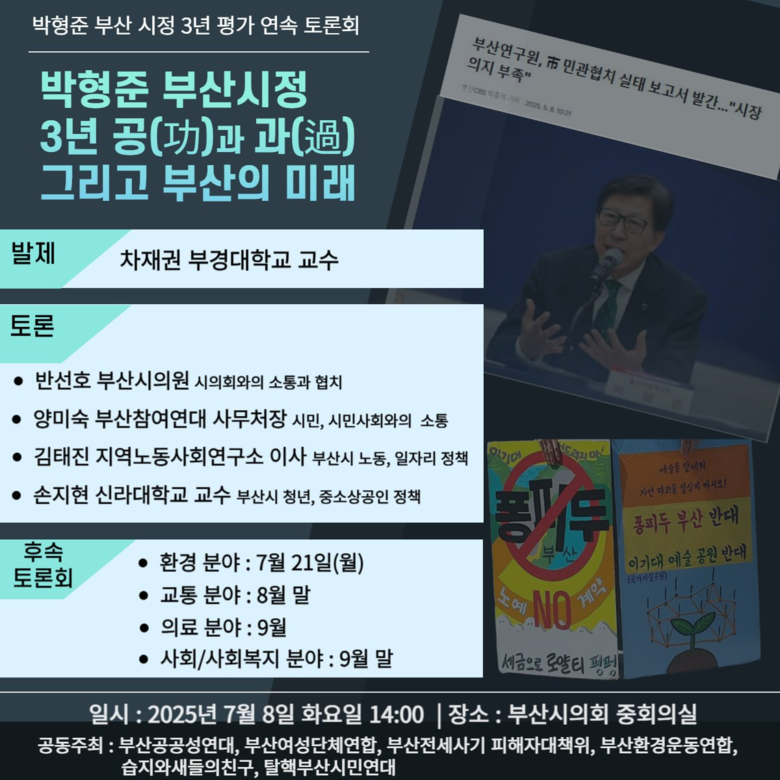 끝으로 반 의원은 “지금 부산시정에는 더 많은 수치보다 더 많은 변화가 필요하고, 더 많은 계획보다 더 많은 실행이 필요하다”며 “시민이 체감할 수 있는 정책, 절차적 정당성과 숙의에 기반한 행정, 재정운영의 투명성을 시정의 기본 원칙으로 재정립해야 할 때”라고 말했다. 이날 토론회는 부산공공성연대, 부산여성단체연합, 탈부산전세사기 피해자대책위, 부산환경운동연합, 습지와새들의친구, 탈핵부산시민연대 등이 공동 주최했으며, 차재권 부경대 교수의 발제를 시작으로, 시민사회와 학계, 정치권의 다면적인 평가가 이어졌다.