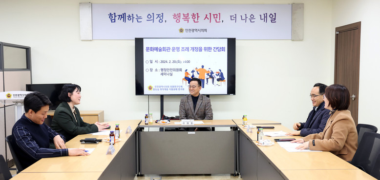 [인천 세계타임즈=심하린 기자] 인천광역시의회 의원 연구단체인 ‘원도심 취약계층 지원 과제 연구회(대표의원 김재동)’는 20일 인천시의회 행정안전위원회 세미나실에서 장애인 문화예술활동 지원 의무 강화를 주제로 ‘문화예술회관 운영 조례 개정을 위한 간담회’를 개최했다.