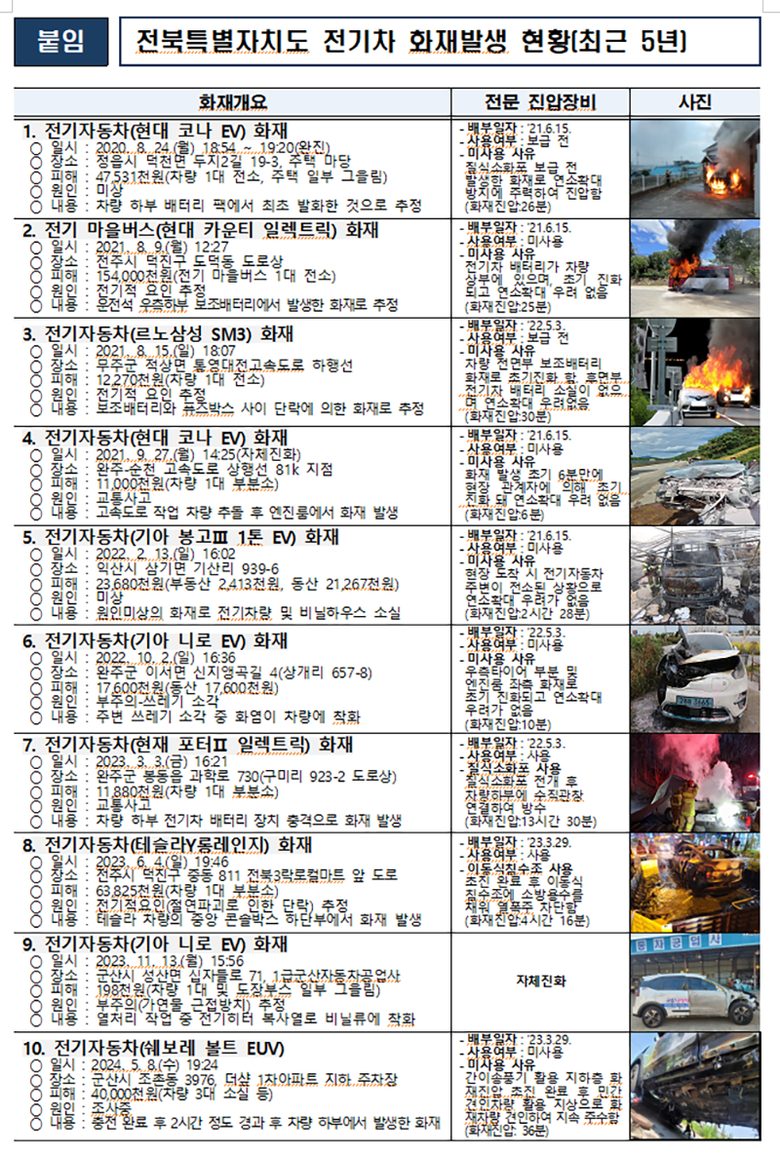 [전북특별자치도의회=세계타임즈 이상호 기자] 전국적으로 전기차 화재로 인해 전기차 충전시설에 대한 불안감이 확산되고 있고, 전북특별자치도 또한 최근 5년 동안 10건의 전기차 화재가 발생했 다. 이러한 상황 속에서 전북특별자치도의회 김이재 의원(전주제4선거구)은 전기차 화재 대응 대책을 마련하고자 ‘전기자동차 전용주차구역의 화재예방 및 안전시설 지원에 관한 조례’ 제정을 추진한다.