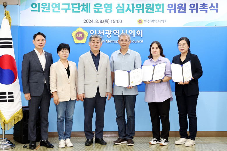 [인천 세계타임즈=심하린 기자] 인천광역시의회(의장 정해권)는 8일 의장 접견실에서 의원 연구단체 운영 심사위원회 위원 6명(외부전문가)을 위촉했다.