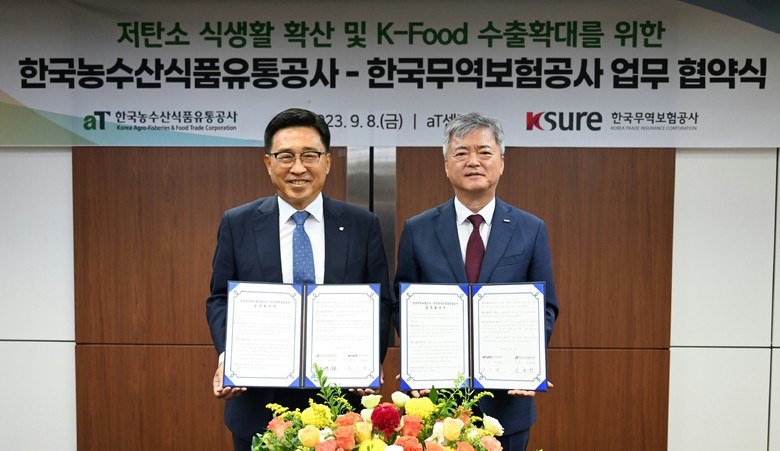 [세계타임즈 = 이현진 기자] 한국농수산식품유통공사(사장 김춘진)와 한국무역보험공사(사장 이인호)는 8일 서울 양재동 aT센터에서 저탄소 식생활 확산과 K-푸드 수출 확대를 위한 업무협약을 체결했다.