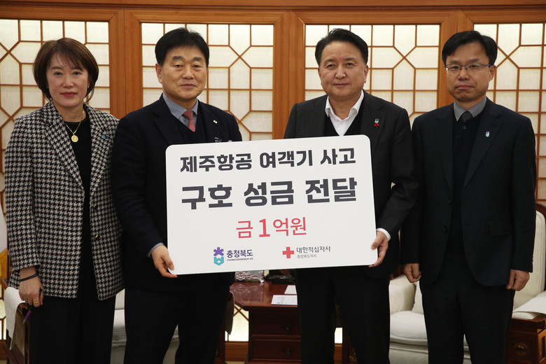 [충북 세계타임즈=이현진 기자] 충북도는 6일(월) 제주항공 여객기 사고 희생자 유가족 지원을 위해 구호 성금 1억 원을 대한적십자사에 전달했다고 밝혔다.