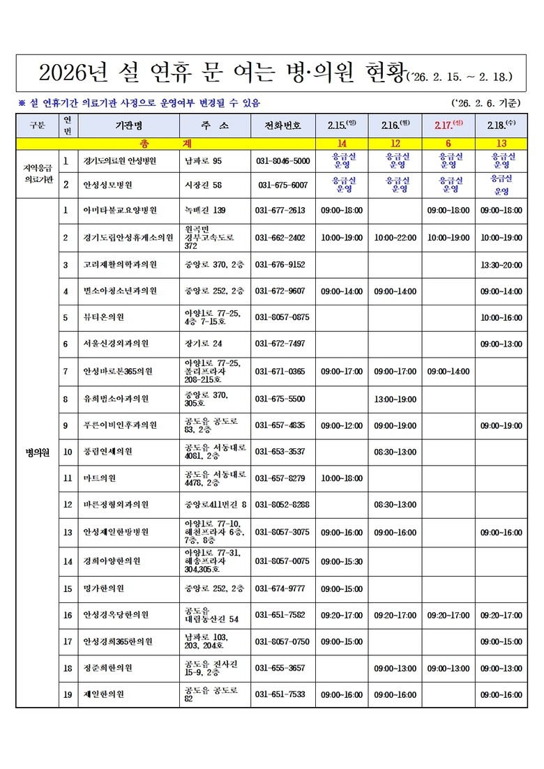 설 연휴 문 여는 병·의원 및 약국 정보는 공동주택 게시판, 또는 보건복지부 콜센터(☎129), 구급상황관리센터(☎119), 경기도 콜센터(☎120)를 통해 확인할 수 있다. 온라인에서는 응급의료포털(www.e-gen.or.kr), 스마트폰 앱 ‘응급똑똑’, 안성시청 및 보건소 누리집에서도 확인 가능하다.