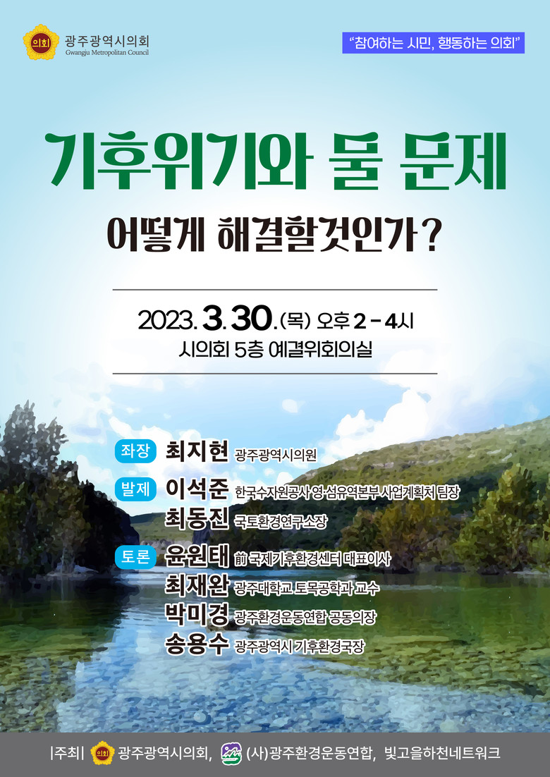 광주광역시의회 최지현 의원(더불어민주당, 광산1)은 30일 오후 2시 시의회 5층 예결위회의실에서 ‘기후위기와 물 문제, 어떻게 해결할 것인가?’를 주제로 토론회를 개최한다.