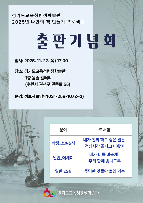 ◦ 창작책 3종(학생 소설&시, 일반 에세이, 일반 소설) 공개 [경기도 세계타임즈=송민수 기자] 경기도교육청평생학습관(관장 류영신)이 ‘2025년 나만의 책 만들기 프로젝트’ 출판기념회를 개최한다.