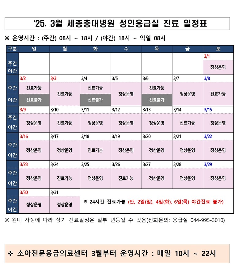 한편, 지역응급의료기관인 엔케이세종병원 응급실은 24시간 정상 진료하고 달빛어린이병원은 평일 오후 11시까지, 주말과 공휴일에는 오후 9시까지 운영된다.
