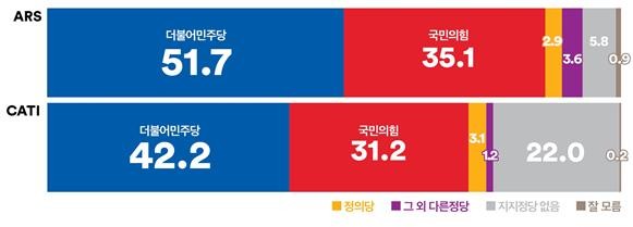 같은 기간 실시한 전화면접조사에서 더불어민주당의 정당 지지율은 0.1%p 하락한 42.2%, 국민의힘 지지율은 0.7%p 하락한 31.2%, 무당층이 20.4%에서 22.0%로 상승했다. 지난주와 비교해 더불어민주당의 전당대회 ‘돈봉투’ 의혹 및 국민의힘과 전광훈 목사와의 갈등으로 인해 높아진 정치불신이 무당층 증가로 이어진 것으로 보인다. 충청과 호남지역에서 더불어민주당의 지지율이 큰 폭으로 빠진 반면 대구경북지역에서는 11.3% 상승했다. 중도층에서의 더불어민주당 지지율도 이번 주 ‘돈봉투’ 관련 구체적 의혹들이 연일 보도되면서 8.1%p 지지율이 빠진 40.4%를 기록하였지만 국민의힘은 그 하락폭을 모두 흡수하지 못하고 3.1%p 상승에 그쳤으며, 무당층 비율이 5%p 이상 증가하였다.