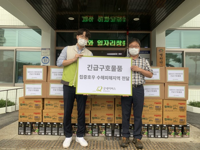 현재 계속되는 폭우로 인하여 끼니 해결 등에 어려움을 겪는 이재민들을 위해, 굿네이버스 대전충남본부는 라면 50박스, 두유50박스, 즉석밥, 김, 참치 통조림 등이 포함된 생필품 키트 50박스, 총 375만원 상당의 물품을 천안시에 전달하였다. 천안시는 지역 내 집중호우로 인하여 침수 등 피해를 입은 수신면, 병천면 등의 지역을 중심으로 물품을 지원할 예정이다.
