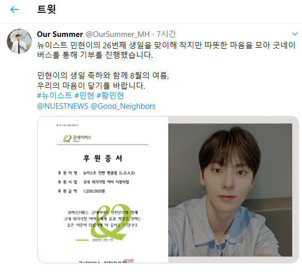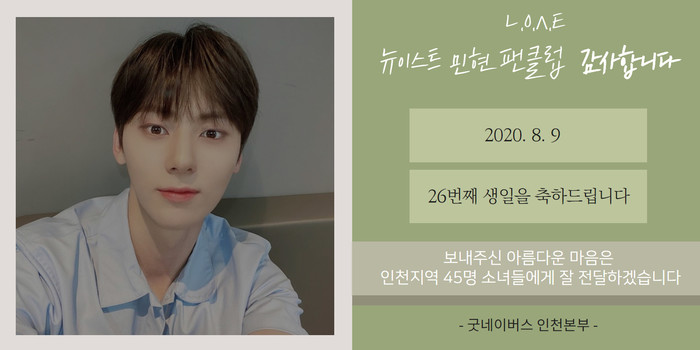 굿네이버스 인천본부(본부장 홍상진)는 8일, 뉴이스트 민현 팬클럽 ‘L.O.Λ.E(러브)’가 민현의 생일을 맞아 국내 위기가정 여아 지원을 위해 120만 원을 기부했다고 밝혔다. 이날 전달된 기부금은 인천 지역 내 위생용품 구입에 어려움을 겪는 여아를 위한 1년치 생리대로 지원될 예정이다.