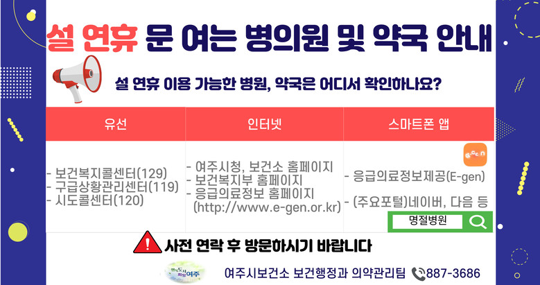 여주시 「설 연휴 문 여는 병·의원 및 약국」운영 현황은 여주시청 홈페이지(공지사항)·여주시보건소(정보광장>공지사항), 응급의료포털(www.e-gen.or.kr), 여주시청 SNS 및 밴드, 보건복지콜센터(☎129), 응급의료정보(E-gen) 앱을 통해 확인할 수 있다.