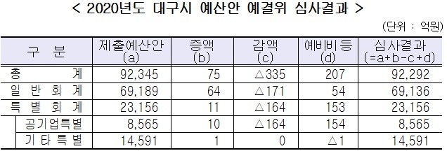 예산결산특별위원회는 취약계층 지원 강화 등 복지서비스강화, 미래형자동차, 첨단의료 등 신성장동력 창출, 미래지향적 도심공간 조성 등을 위한 불요불급한 예산의 필요성을 인정하되, 지방세수 감소와 복지재정 부담 증가 등 어려운 재정여건임을 감안해 재정건전성에 중점을 두고 심사하여 2020년도 예산을 9조 2,292억원으로 확정하였다.