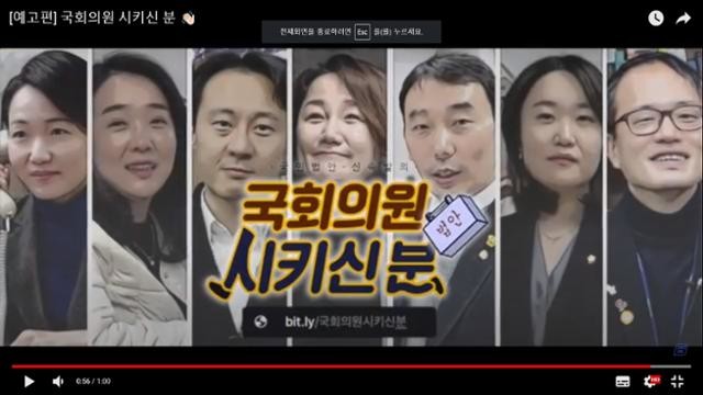 1분 짜리 해당 영상은 유튜브 다스뵈이다에서 공개 되었된 더불어민주당 7명의원이 만든 국회의원 시키신 분의 국회의원들에게 이런 거 법으로 만들어달라라고 말할 수 있는 창구가 생겼다. 바로 더불어민주당의 국민 입법 제안 공모 국회의원 시키신 분프로젝트다.