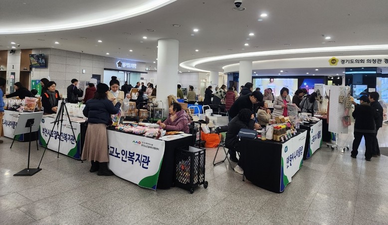 | ▲경기도청 1층 로비에서 2026년 설맞이 노인생산품 판매행사가 진행 중이다.(사진=경기도사회서비스원) |