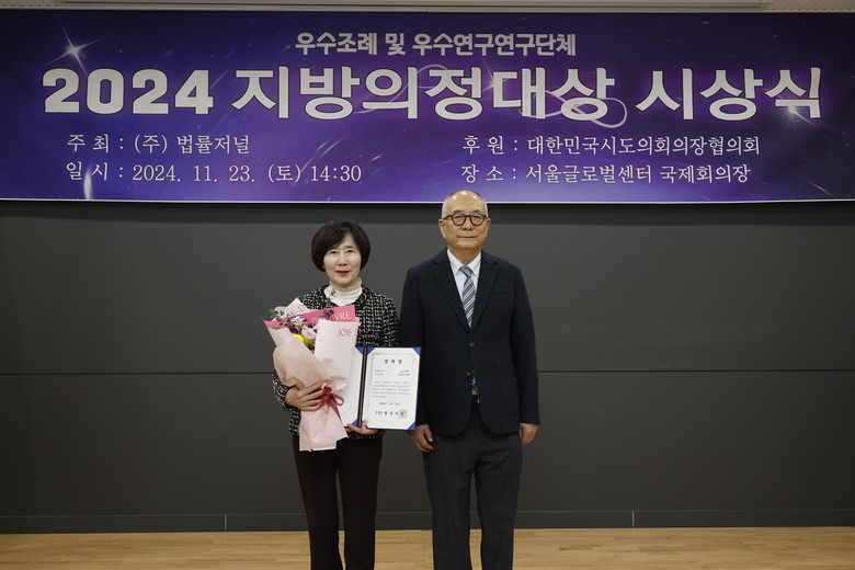 이번 시상식은 대한민국시도의회의장협의회가 후원하며, 주민소통과 대다수 주민들의 복리 증진에 영향을 미친 우수조례를 발의하고 지방자치 발전에 크게 기여한 의원을 수상자로 선정했다.