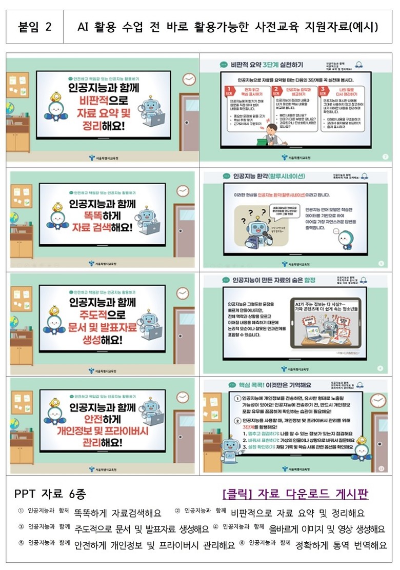○ [지원자료] 현장 안착을 위한 맞춤형 지원: 가이드라인의 실효성을 높이기 위해 도입과 활용에 필요한 각종 서식을 제공한다. 특히, 생성형 AI 활용 수업에 앞서 교사가 별도 제작 부담 없이 바로 활용할 수 있는‘사전 교육용 PPT’를 함께 지원하며 , senGPT와 연계한 가이드라인 전용 챗봇을 통해 현장의 궁금증을 실시간으로 해소할 예정이다.