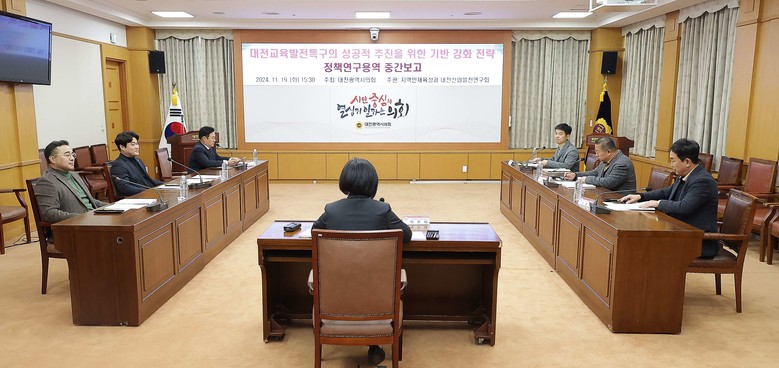 [대전 세계타임즈=이채봉 기자] 대전시의회 의원연구회인 「지역인재육성과 대전산업발전 연구회」(회장 박주화 의원)는 19일 시의회 소통실에서 ‘대전교육발전특구의 성공적 추진을 위한 기반 강화 전략 연구용역’ 중간보고회를 개최했다.