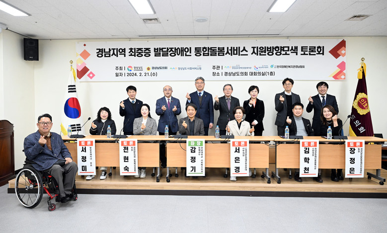 경상남도, 경상남도의회, 경상남도사회서비스원이 공동으로 주최한 이번 토론회는 오는 6월 시행 예정인 최중증 발달장애인 통합돌봄서비스의 원활한 추진을 위해 지자체 및 유관기관 관계자들의 의견을 청취하고 서비스 추진에 따른 지원방안을 모색하고자 마련됐다.