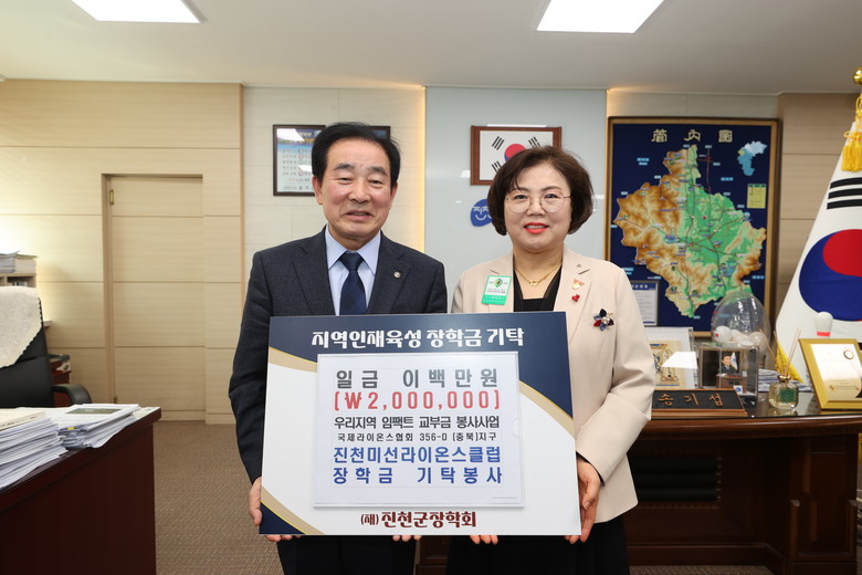 진천미선라이온스클럽(회장 박미선, MG진천새마을금고 상무)은 10일 진천군청을 방문해 (재)진천군장학회(이사장 송기섭)에 장학금 200만원을 전달했다.