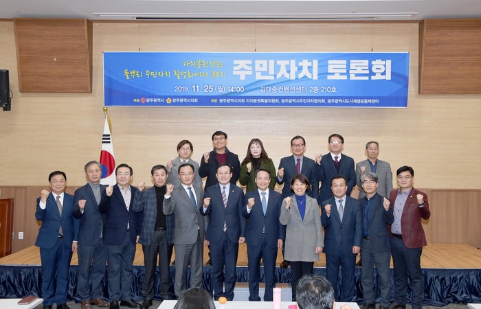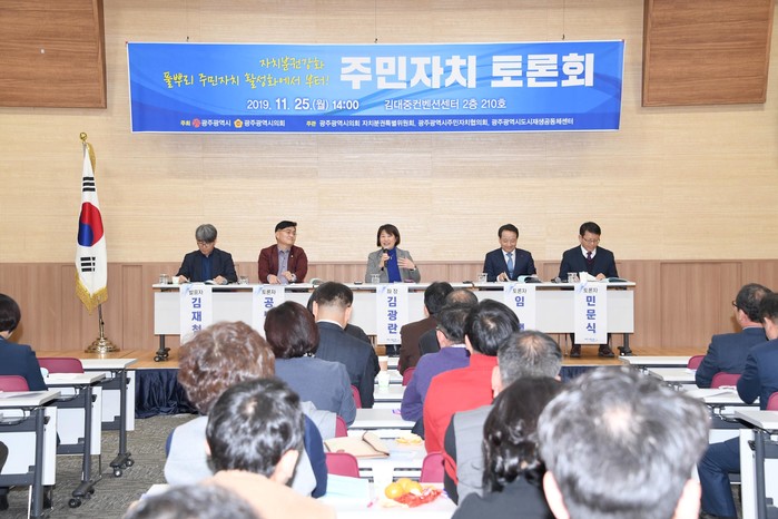 [광주=세계타임즈 손권일 기자] 광주광역시의회(의장 김동찬)는 11월25일 오후 김대중센터 210호 회의실에서 각 주민자치위원들이 참석 한 가운데 김광란 의원을 좌장으로 '자치분권강화 풀뿌리 주민자치 활성화' 토론회를 개최했다