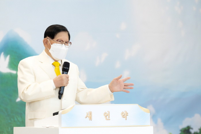 | ▲이만희 총회장이 13일 열린 신천지 창립 38주년 기념예배에서 신천지 창립 의미에 대해 설교하고 있다.(제공=신천지예수교회) |