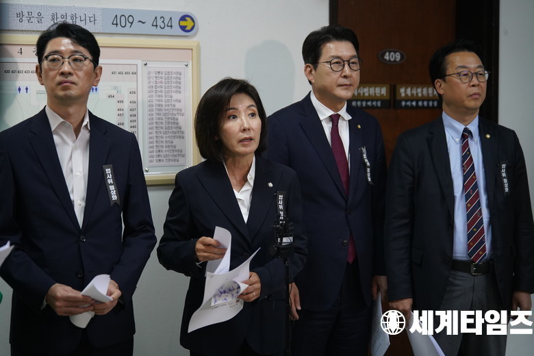 국민의힘 '나경원' 등 법제사법위원회 위원들이 16일 서울 여의도 국회에서 법사위 국장감사 중지후 기자회견을 하고 있다.