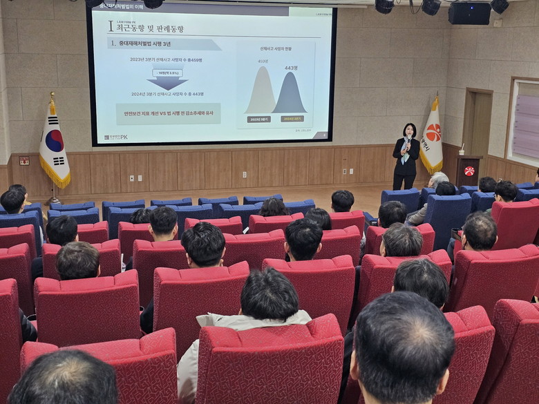 중대시민재해 교육은 박지연 법무법인 PK 대표변호사를 강사로 초청해 ▲중대재해 처벌 최근 동향 및 판례 동향 ▲중대재해처벌법의 주요 내용 및 사례 ▲중대재해처벌법 벌칙해석 등에 대해 교육했다.