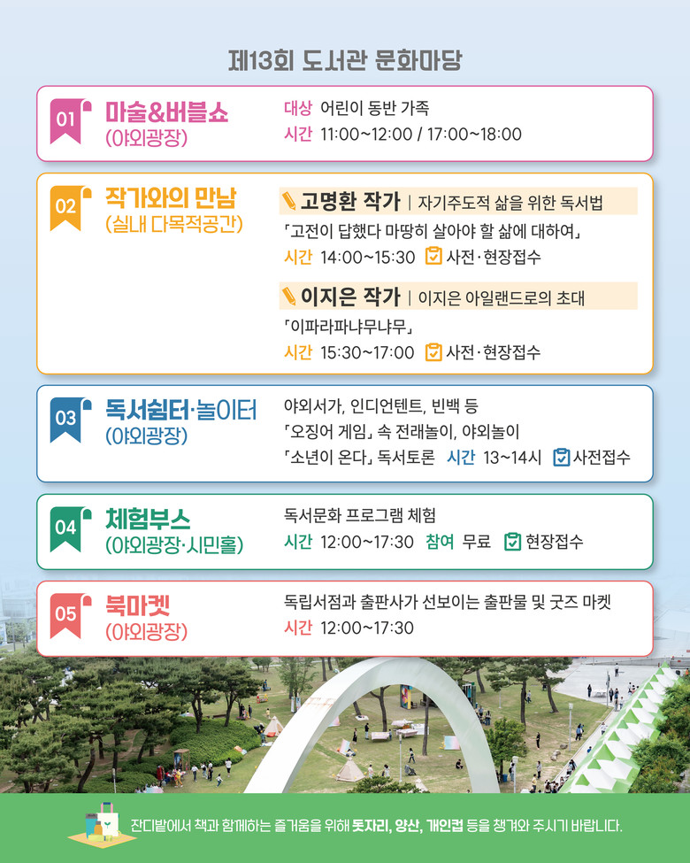 이정선 교육감은 "도서관 문화마당을 통해 시민들이 독서하며 삶의 가치를 발견하는 기회를 얻었으면 한다"며 "많은 시민이 참여해 문학과 책이 주는 즐거움을 만끽하길 바란다“고 말했다.