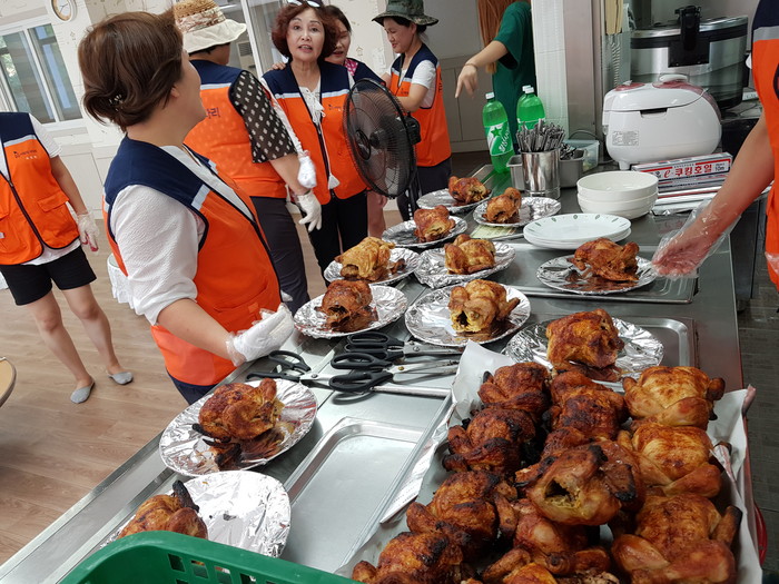 이날 통닭 봉사는 2018년 여름음악캠프에 참석한 아이들을 위해서 자원봉사자 20명이 참석하여 물놀이후에 간식으로 통닭을 전달했다.