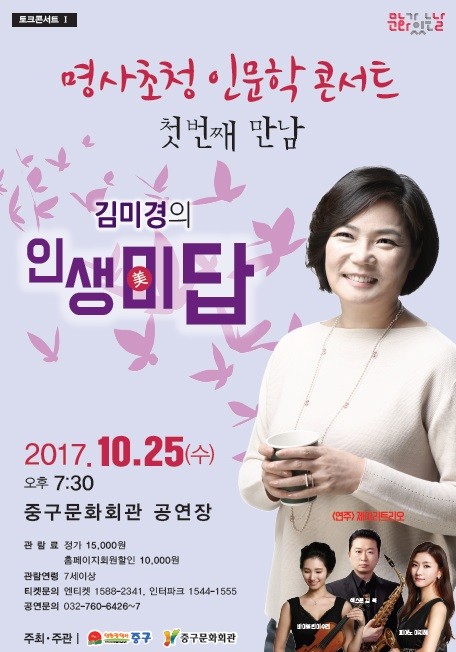 [인천 중구=세계타임즈 심동윤 기자] 다양한 분야 전문가의 토크와 음악을 접목시킨 인문학 콘서트가 10월 25일을 시작으로 11월과 12월 마지막 주 수요일 저녁 7시 30분 문화가 있는 날을 맞아 중구문화회관 공연장에서 열린다.