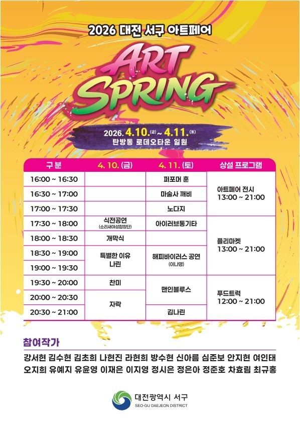 대전 서구는 오는 10일부터 11일까지 탄방동 로데오거리 일원에서 ‘2026 대전 서구 아트페어 아트스프링(ART SPRING)’ 축제를 개최한다.