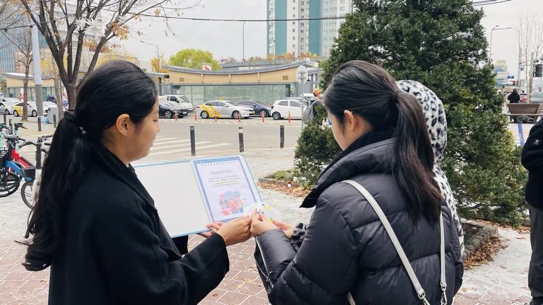 | ▲5일 신천지 바돌로매지파 홍보팀이 ‘편파적인 종교탄압’ 규탄 시민 동의 활동을 진행하는 가운데 시민이 동의 스티커를 붙이고 있다 [사진 제공 = 신천지 바돌로매지파] |